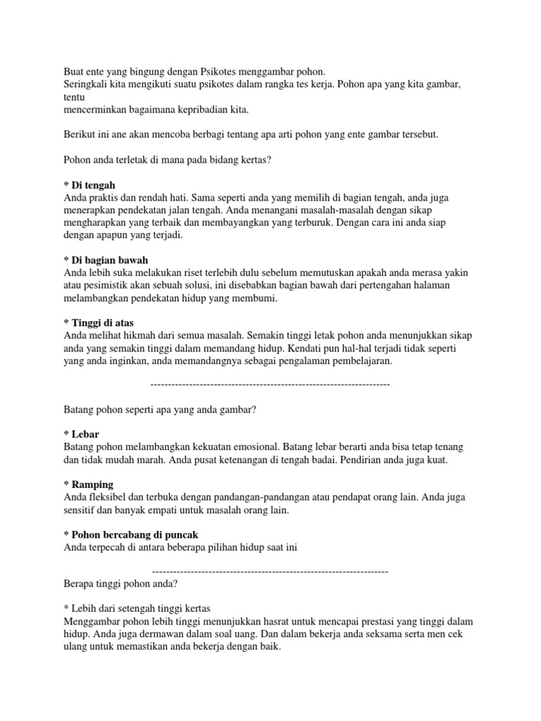Psikotes gambar baik gambaran rumah kemudian pohon dan orang merupakan sebuah cara yang dilakukan oleh perusahaan dalam melihat karakteristik dari para kendidat karyawan baru mereka.inilah kenapa,hampir di setiap psikotes akan selalu muncul bentuk soal yang seperti ini. Bukan karena beringin itu mudah digambar, tapi lebih karena sifat beringin sudah dianggap sangat ideal untuk seseorang. Feb 23, 2021 · contoh psikotes gambar pohon yang baik dan benar yang akan saya bahas sudah lengkap dengan penjelasan dan cara menggambarnyasalah satu bentuk yang paling umum adalah pohon mangga atau yang berkambiumtetapi ada point penting dalam pembuatanyajadi silahkan fahami dengan baik penjelasan dalam artikel kali ini. Membuat rencana gambar apa saja yang akan anda buat dari kedelapan kotak yang ada pada soal. Tes kraepelin dan pauli atau dikenal sebagai tes koran merupakan sebuah tes yang berbentuk sejumlah deretan angka kolom.